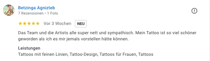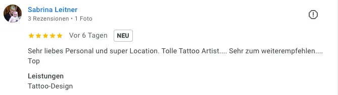 „Sehr liebes Personal und super Location. Tolle Tattoo Artists – sehr zum Weiterempfehlen. Top.“