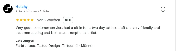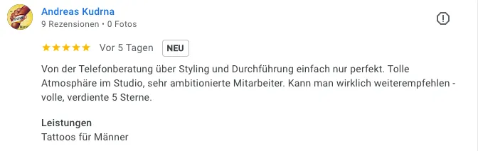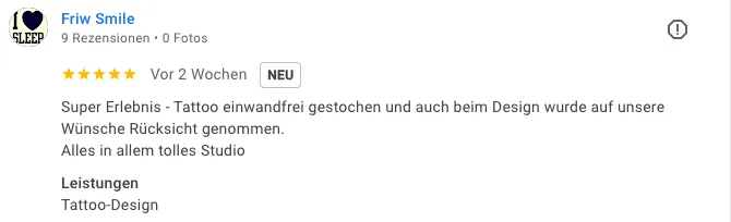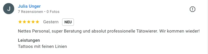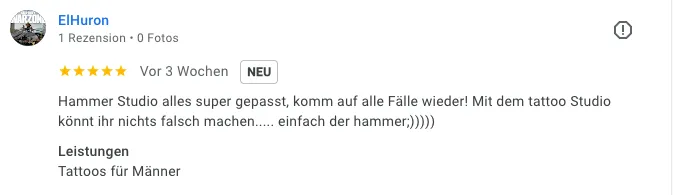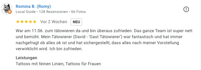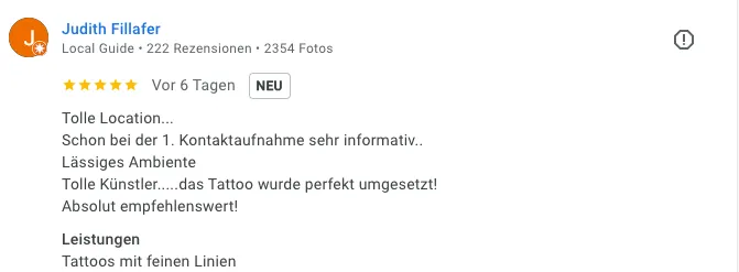 „Tolle Location. Schon bei der ersten Kontaktaufnahme sehr informativ. Lässiges Ambiente, tolle Künstler – das Tattoo wurde perfekt umgesetzt! Absolut empfehlenswert!“