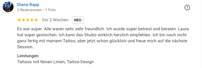„Es war super. Alle waren sehr, sehr freundlich. Ich wurde super betreut und beraten. Laura hat super gestochen. Ich kann das Studio wirklich herzlich empfehlen. Ich bin noch nicht ganz fertig mit meinem Tattoo, aber jetzt schon glücklich und freue mich auf die nächste Session.“