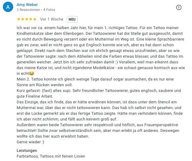 „Ich war vor ca. einem halben Jahr hier, für mein erstes richtiges Tattoo – für ein Tattoo meiner Kindheitskatze über dem Ellenbogen. Der Tätowierer hat die Stelle gut ausgesucht, damit es nicht durch Bewegung verzerrt oder ein Muttermal im Weg ist. Kleine Sprachbarriere, aber es hat geklappt. Anfangs war ich unsicher, aber nach dem Abheilen sieht das Tattoo wunderschön aus. Mein zweites Tattoo konnte ich gleich wenige Tage später machen lassen. Sehr freundlicher Tätowierer, gute Fine-Line-Arbeit. Respektvoller Umgang, sehr professionell. Bin jetzt sehr zufrieden.“