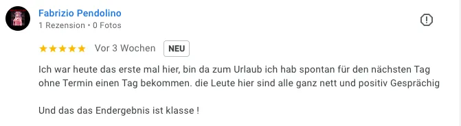 „Ich war heute das erste Mal hier, bin da zum Urlaub und hab spontan für den nächsten Tag ohne Termin einen Termin bekommen. Die Leute hier sind alle ganz nett und positiv gesprächig. Und das Endergebnis ist klasse!“