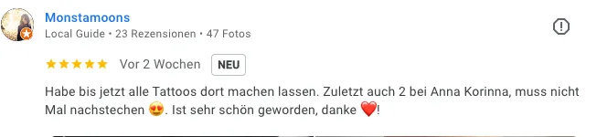 „Habe bis jetzt alle Tattoos dort machen lassen. Zuletzt auch 2 bei Anna Korinna, musste nicht mal nachstechen. Ist sehr schön geworden, danke!“