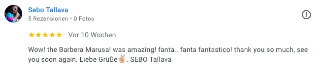 „Wow! Die Barbera Marusa war amazing – fanta fantastico! Vielen Dank, see you soon again. Liebe Grüße, Sebo Tallava.“