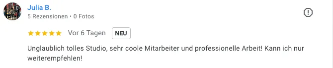 „Unglaublich tolles Studio, sehr coole Mitarbeiter und professionelle Arbeit! Kann ich nur weiterempfehlen!“