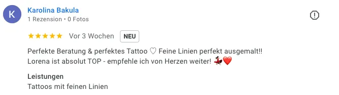 „Perfekte Beratung & perfektes Tattoo. Feine Linien perfekt ausgemalt!! Lorena ist absolut TOP – empfehle ich von Herzen weiter.“