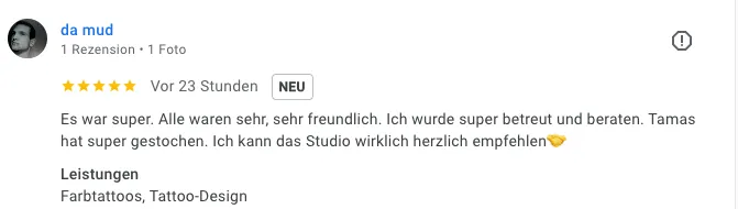„Es war super. Alle waren sehr freundlich. Ich wurde super betreut und beraten. Tamas hat super gestochen. Ich kann das Studio wirklich herzlich empfehlen.“